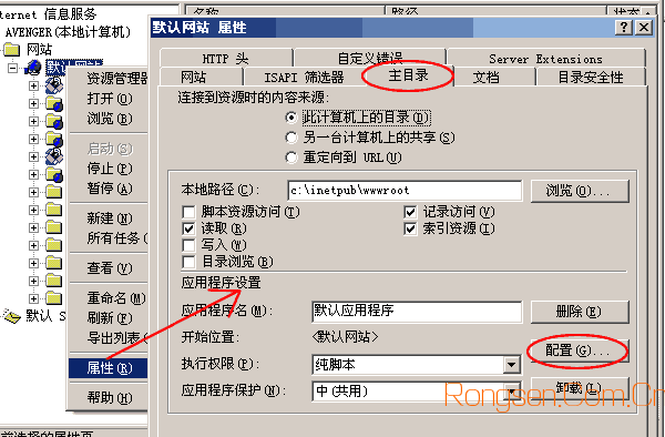 3.打开你的IIS信息服务控制台,右击"默认网站"图标,选择属性,打开默认网站属性选择,然后再选择"主目录"选项卡,如下图所示: