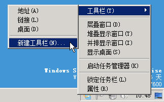 如下图 3,在 Windows Server 2008 R2 底部的工具栏上,单击鼠标右键,选择「工具栏」→「新建工具栏」。