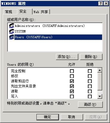 Windows目录要加上给users的默认权限,否则ASP和ASPX等应用程序就无法运行。以前有朋友单独设置Instsrv和temp等目录权限,其实没有这个必要的。